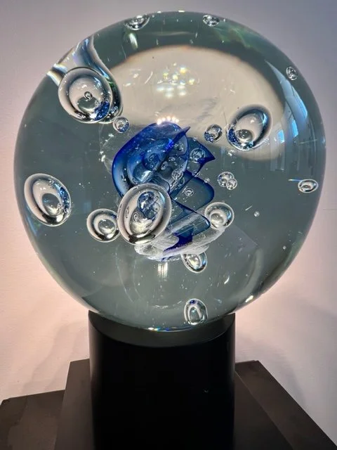 Målningar på glasskivor och glasskulpturer.